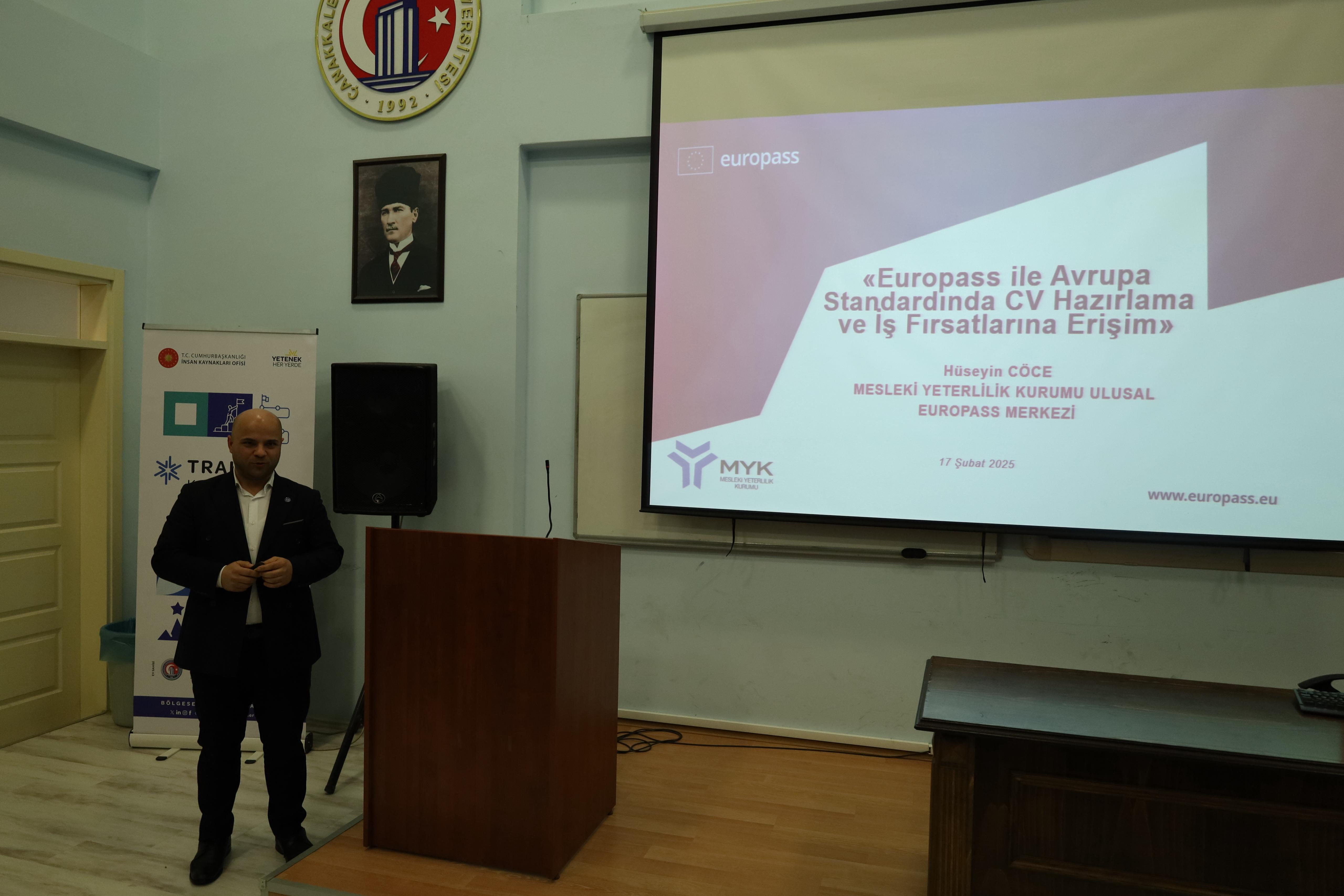 Mesleki Yeterlilik Kurumu Ulusal Europass Merkezi, 17-18 Şubat 2025 tarihlerinde Çanakkale Onsekiz Mart Üniversitesi ev sahipliğinde gerçekleştirilen “Trakya Kariyer Fuarı” etkinliğinde bilgilendirme semineri gerçekleştirdi.